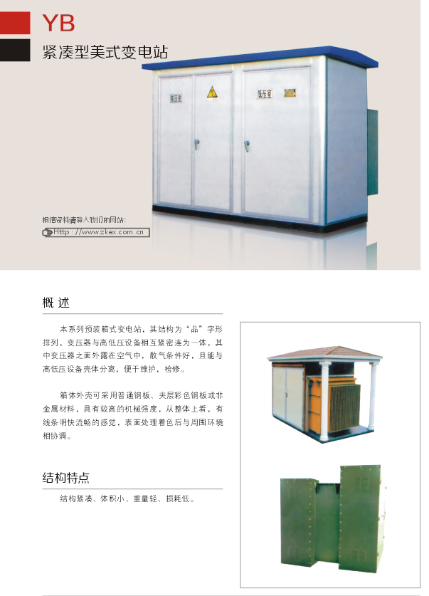 本系列預裝箱式變電站,其結構為“品”字形.排列,變壓器與高低壓設備相互緊密連為一體,其中變壓器之面外露在空氣中,散氣條件好,且能與高低壓設備殼體分離,便于維護,檢修。箱體外殼可采用普通鋼板、夾層彩色鋼板或非金屬材料。具有較高的機械強度,從整體上看,有線條明快流暢的感覺,表面處理著色后與周圍環境相協調。